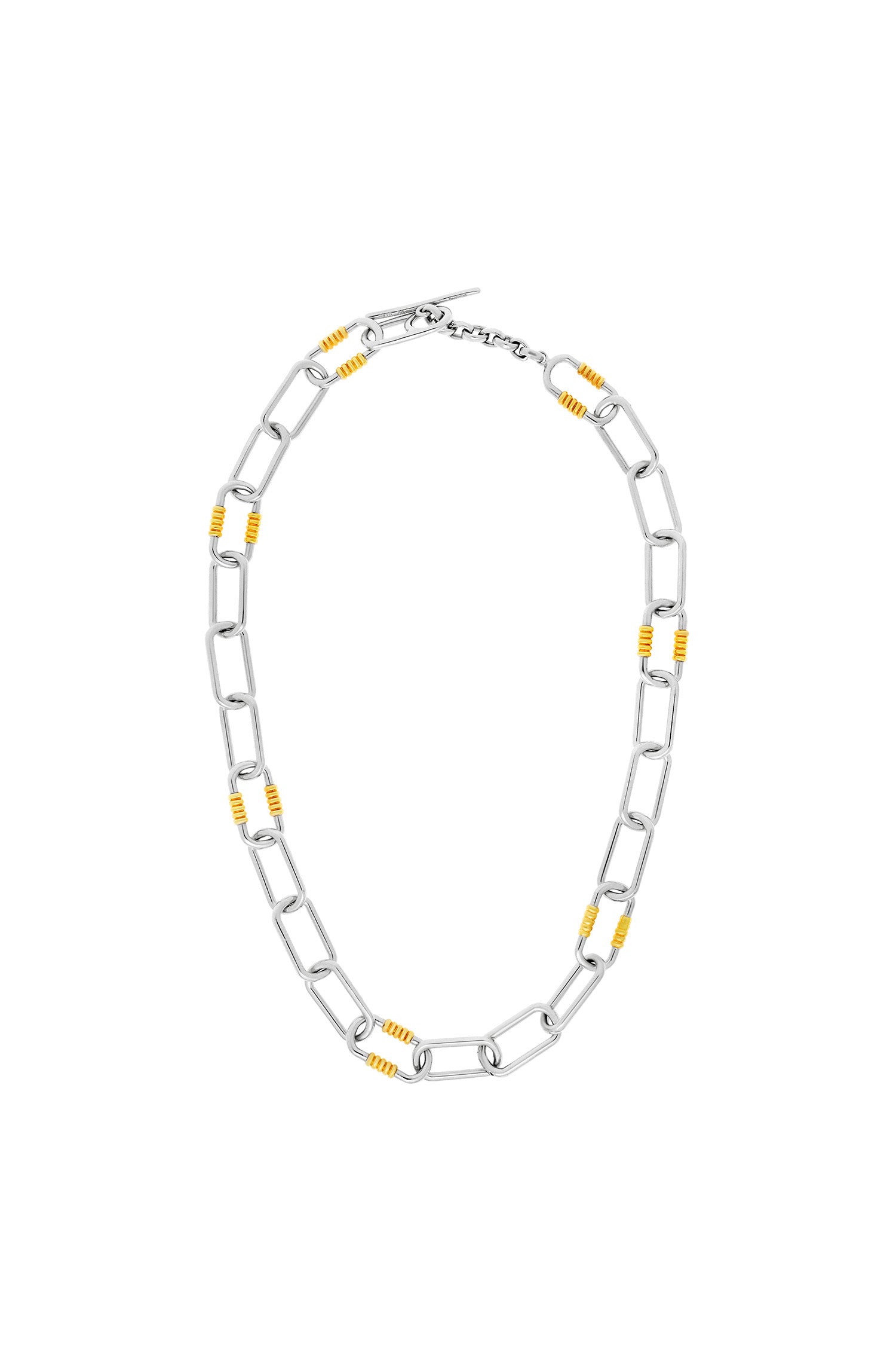 Krikos necklace, a sophisticated variation of the classic chunky chain. With its simple sculptural form and intricate mixed metal design, the Krikos necklace is sure to become your next go-to accessory.